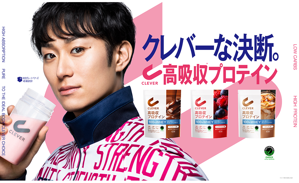 柳田選手を起用した新キービジュアルを掲出した特設ブースにて、新商品『クレバー高吸収プロテイン』全3フレーバーをいち早く試飲できる体験展示を実施いたします!