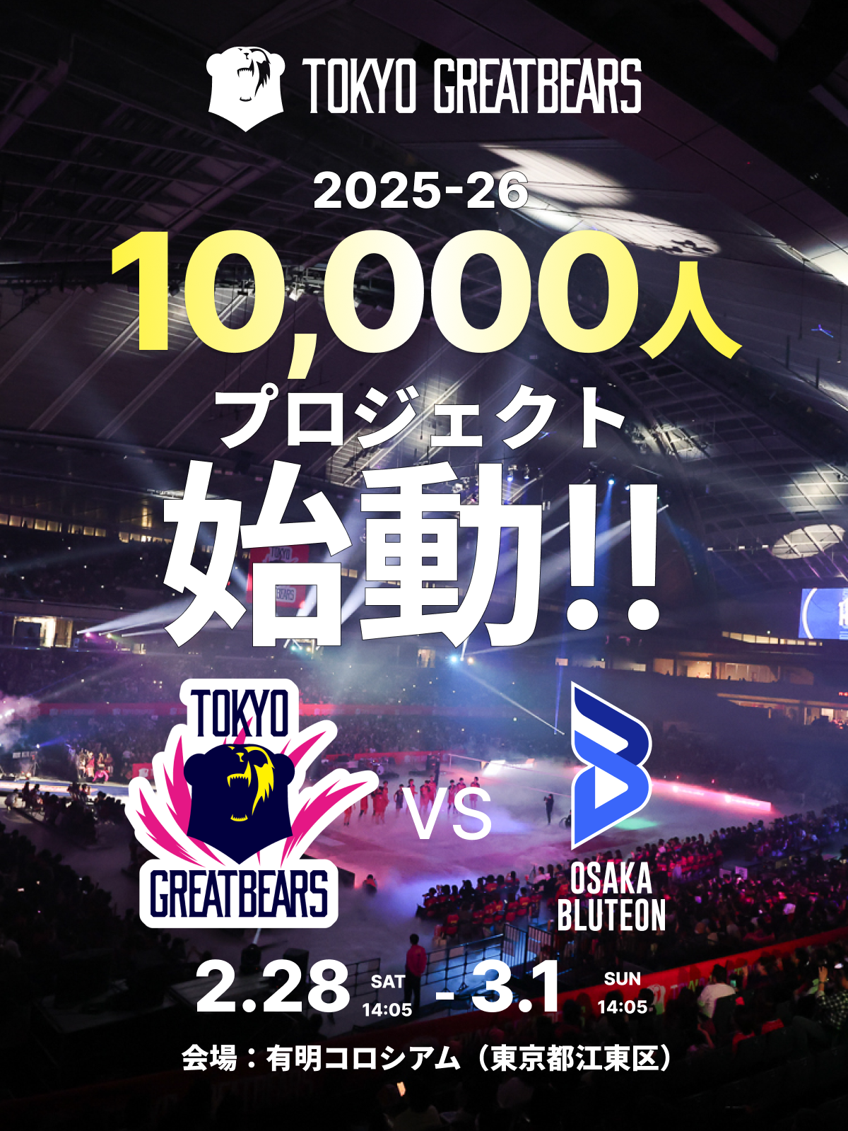 2026年2月28日(土)、3月1日(日)の東京グレートベアーズ ホームゲーム 大阪ブルテオン戦を「10,000人プロジェクト」と銘打って開催することが決まりましたので、お知らせいたします。