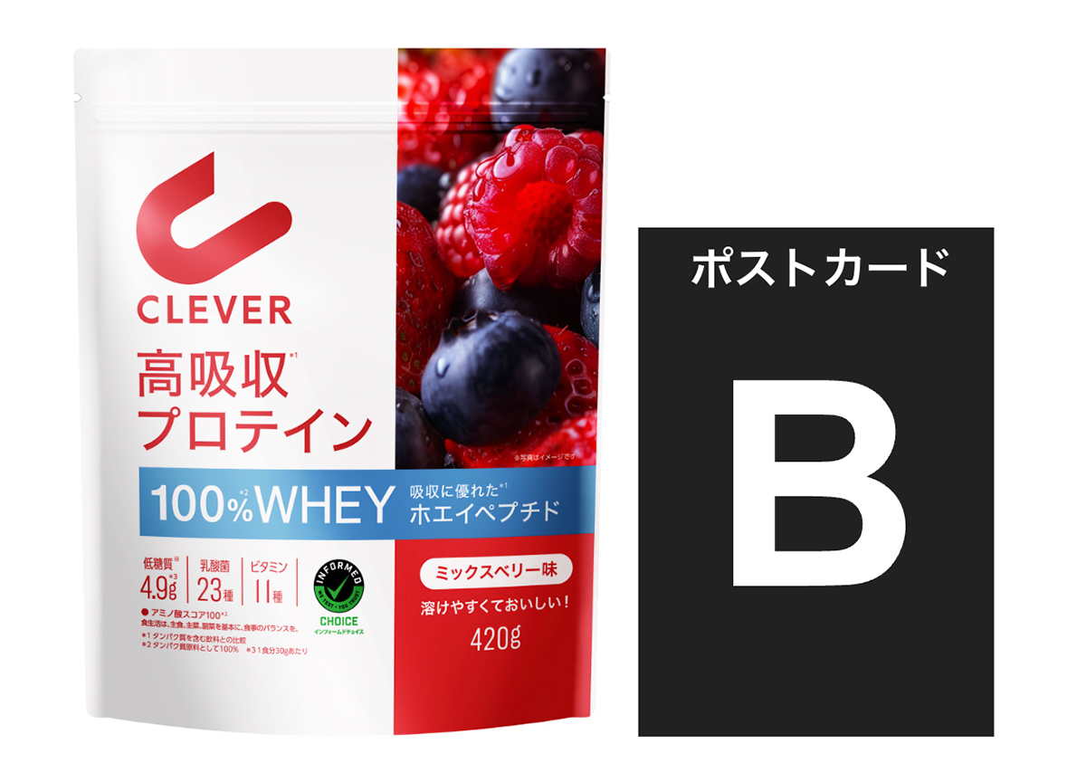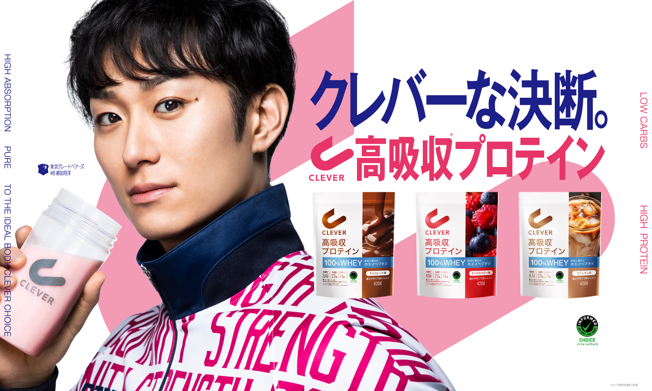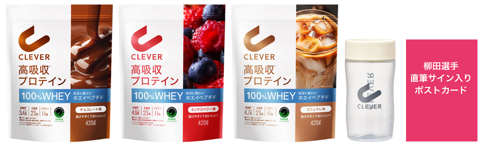 また、2026年2月14日(土)15日(日)に有明コロシアムにて開催される、大同生命SV.LEAGUE MEN 東京グレートベアーズ ホームゲーム ジェイテクトSTINGS愛知戦にて、柳田選手を起用した新キービジュアルの特設ブースで、新商品の『クレバー高吸収プロテイン』3フレーバーをひと足早く試飲できる展示を実施いたします。さらに、ブースで『クレバー高吸収プロテイン』をご購入いただくと、数量限定で柳田選手のポストカードをプレゼントいたします(全4種)。ぜひ会場にお越しいただき、クレバーの新商品を体験ください。