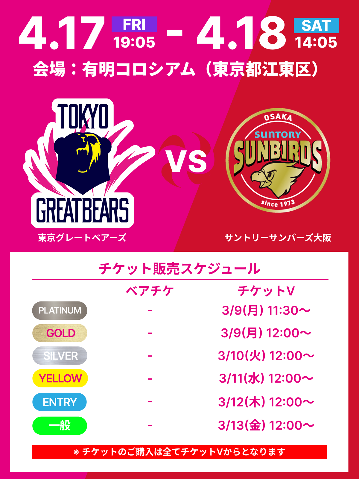 このたび、2026年4月17日(金)、18日(土)に有明コロシアムにて開催される、ホーム最終節サントリーサンバーズ大阪戦のチケット発売日、及び金額が決まりましたので、お知らせいたします。
